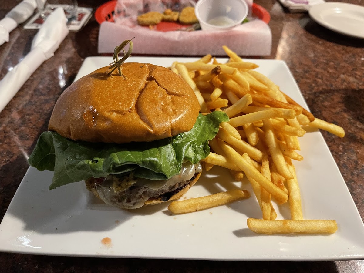 My wife and I had lunch here today. I had the salmon with rice and green beans. The salmon was pretty good rice and green beans were little on the greasy side. My wife had potato skins and she didn’t care for them too much not much cheese and they were pretty greasy Very nice waitress very friendly. She was professional.